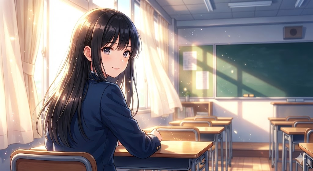 窓際の学校の机に座っている、黒髪ロングの可愛い日本人女子高生の高品質なポートレート。 カーテン越しに強い日差しが差し込み、髪にハロー効果(光の輪)を作り出している。 彼女は振り返って、優しい笑顔でこちらを見ている。 彼女はクラシックな紺色のブレザー制服を着ている。 背景は黒板のある、詳細な日本の教室。