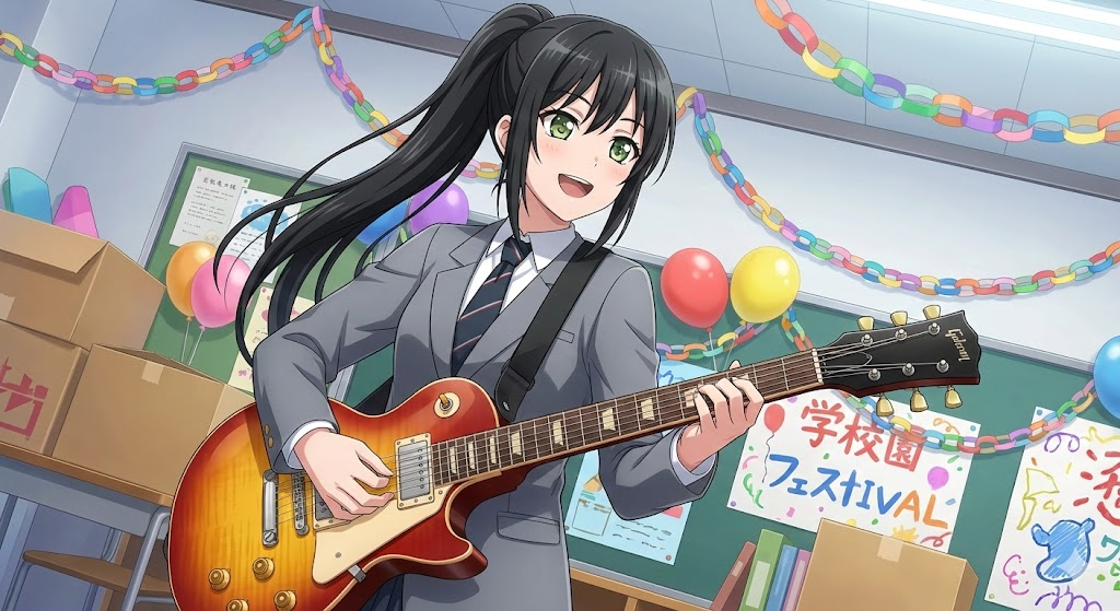 最後は「動」のシーンです。文化祭前の散らかった教室で、エレキギターを練習している様子を生成しました。ごちゃごちゃした背景を描かせても破綻しにくいのが最新AIの強みです。