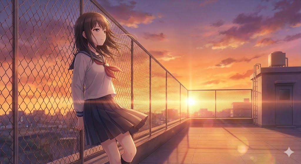 夕暮れ時の学校の屋上に立っている、同じ女子高生のセンチメンタルなショット。 空はオレンジと紫の色調で彩られている。 風が彼女の髪とスカートをわずかになびかせている。 彼女は金網フェンスに寄りかかり、少し憂いを帯びた表情で遠くを見つめている。 ゴールデンアワー(黄金色の時間帯)の照明、レンズフレア。