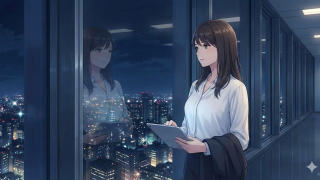 夕暮れ時の学校の屋上に立っている、同じ女子高生のセンチメンタルなショット。 空はオレンジと紫の色調で彩られている。 風が彼女の髪とスカートをわずかになびかせている。 彼女は金網フェンスに寄りかかり、少し憂いを帯びた表情で遠くを見つめている。 ゴールデンアワー(黄金色の時間帯)の照明、レンズフレア。
